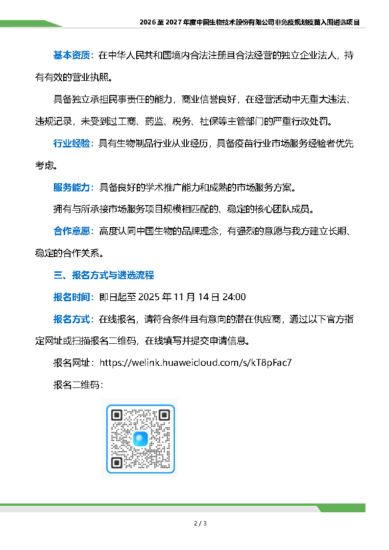 2026 至 2027 年度中國生物技術(shù)股份有限公司非免疫規(guī)劃疫苗常規(guī)市場服務(wù)供應(yīng)商入圍遴選項(xiàng)目招商公告