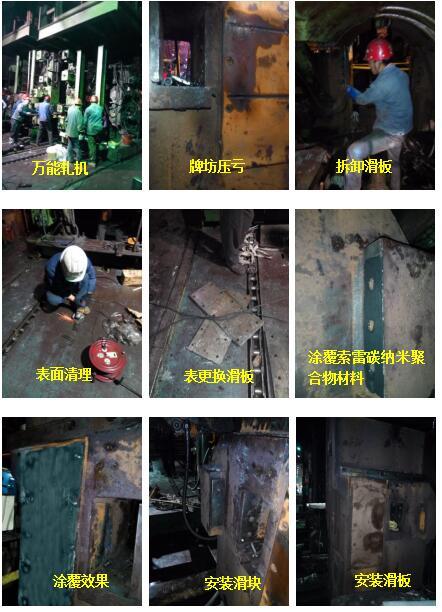 一般針對(duì)軋機(jī)牌坊滑塊位壓虧的問(wèn)題,企業(yè)通常采用添加金屬墊片來(lái)解決此類問(wèn)題,由于壓虧部位尺寸不均勻,導(dǎo)致其修復(fù)效果不理想。激光熔覆技術(shù)修復(fù)成本過(guò)高,工期長(zhǎng)等原因無(wú)法在短時(shí)間內(nèi)完成修復(fù),F(xiàn)場(chǎng)修復(fù)是近幾年興起的一種檢修模式,其原理是在不機(jī)加工的前提下,采用索雷碳納米聚合物材料修復(fù)技術(shù)在現(xiàn)場(chǎng)進(jìn)行修復(fù)。修復(fù)用的材料固化后形成的化學(xué)鍵連接作用力使其與修復(fù)的金屬部件形成優(yōu)異的粘著力,滿足設(shè)備在運(yùn)行中承受各種復(fù)合力的要求。此類修復(fù)材料性能較為可靠。