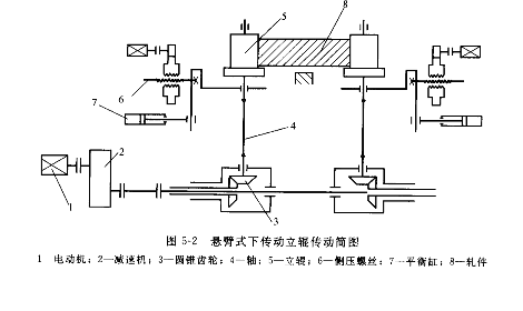 懸臂式下傳動立輥結(jié)構(gòu)簡單,換輾方便,-一般在板坯厚度小于 100~150mm 時采用。圖5-2 所示為懸臂式下傳動立輥傳動簡圖。懸臂固定在軸 4上的立輥5,是由電動機(jī) 1通過減速機(jī) 2 和圓錐齒輪3 傳動。調(diào)節(jié)軋輥開口度時,在側(cè)壓螺絲 6 的作用下,軋輥的平衡是用平衡缸 7來實現(xiàn)的。