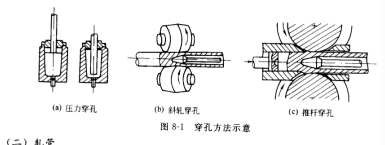 即將實心管壞穿孔成空心毛管。常見的管壞穿孔方法有斜軋穿孔(二輾、狄舍爾和三輾)、壓力穿孔和推桿穿孔 (PPM) 等三種,如圖 8-1 所示。另外還有直接采用離心澆注,連鑄與電渣重熔等方法獲得空心管坯,而省去穿孔工序。