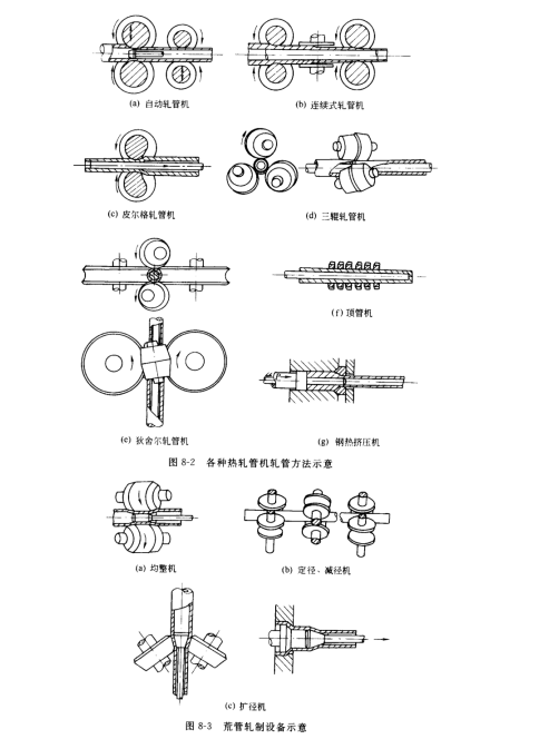 軋,管是將空心毛管軋成接近成品尺寸的荒管。常見的軋管方法有自動軋管機、連續(xù)式軋管機(全浮動式 MM、限動心棒 MPM)、皮爾格軋管機(周期式軋管機)、三輾軋管機、狄舍爾軋管機、頂管機和鋼熱擠壓機,如圖 8-2所示。