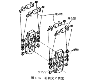 上、下交叉輥的傳動(dòng)裝置用電機(jī)驅(qū)動(dòng),調(diào)整工作輥和支承輥軸承座的交叉頭是由電動(dòng)機(jī)通過(guò)蝸輪減速機(jī)同時(shí)驅(qū)動(dòng)的。當(dāng)軋輥軸承座間隙過(guò)大時(shí),交叉頭之間的擴(kuò)大和縮小的微調(diào)是通過(guò)四臺(tái)電動(dòng)機(jī)和八個(gè)離合器來(lái)完成的。